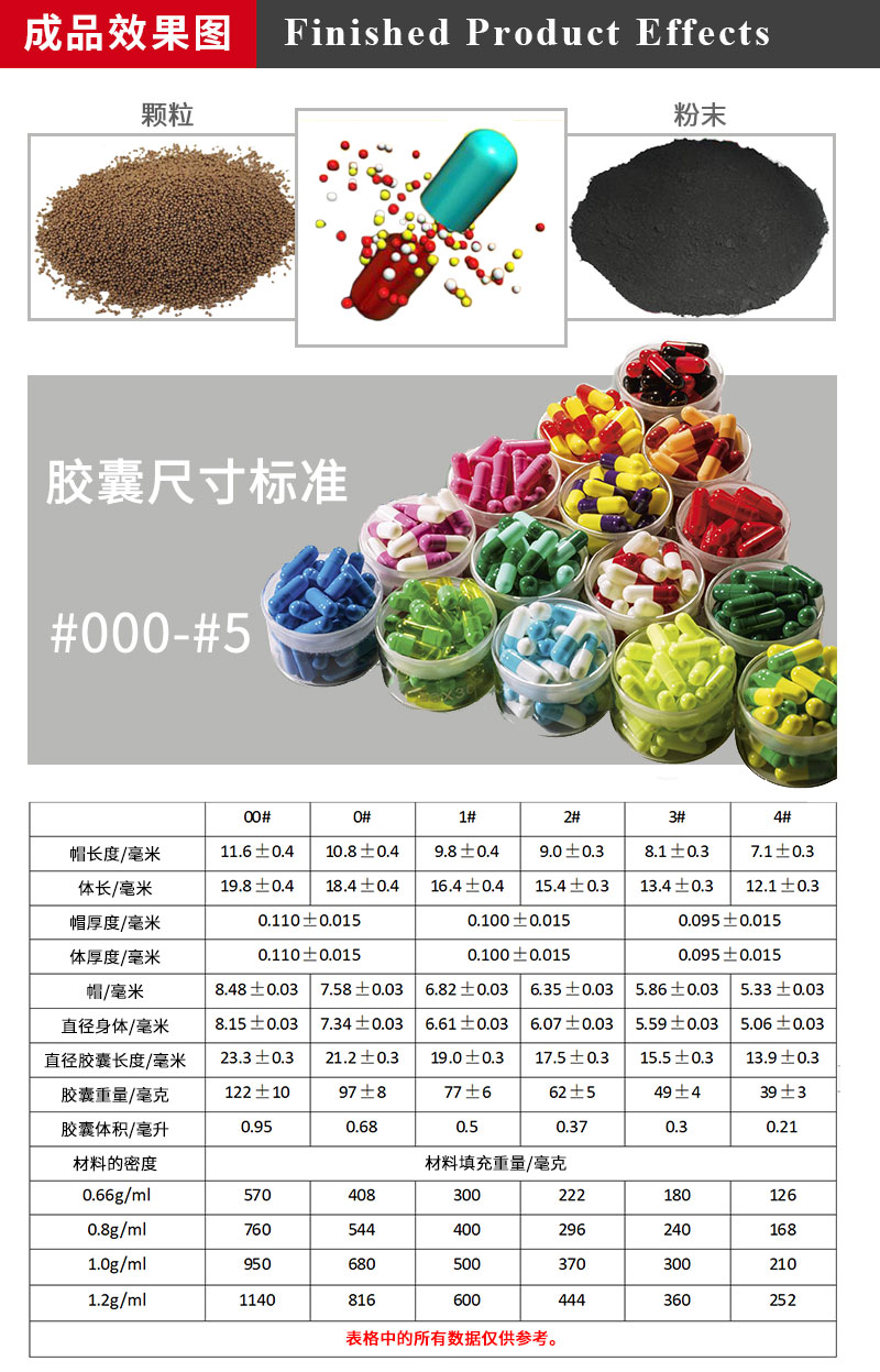 4. Suitable for 00#, 0#, 1#, 2#, 3#, 4# capsules, suitable for filling various kinds of powders and granules in various types of capsules;